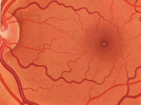 高血压病的眼底改变:黄斑部静脉螺旋状迂曲(Guist氏征)。
