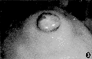 患儿男,4岁。因左眼结节及头顶部肿物4年,于1998年11月就诊。患儿生后即发现左眼上睑外侧结节,其上面有细毛生长,中央有一小孔,每当哭闹时即从此孔内流出似泪液,同时亦发现头顶囟门处肿物,开始如樱桃大,以后随年龄的增长而增大,现如鸡蛋黄大,患儿无任何症状,亦无语言及肢体运动障碍,未予以治疗。其母为高龄初产,怀孕时已42岁,有孕期服药史(药名不详),家族中无类似疾病及其遗传病史。体检:头颅顶处可见鸡蛋黄大小的囊性肿物约3 cm×2 cm×2 cm,表面光滑,可见扩张的血管,局部1/3呈紫黑色,2/3呈粉红色,质软,有压痛及波动感,其周围毛发正常,余未见异常。眼部检查:双眼视力1.0。右眼正常。左眼上睑外侧眉弓处可见一隆起的结节约5 mm×4 mm×3 mm,其上可见睫毛状细毛生长,中央有一瘘口,被细毛围绕,哭泣时有似泪液流出(图1~3)。瘘口周围皮肤正常,眉毛被瘘口分开而不连续,瘘口部即外上方眶骨缺损约2.0 cm×1.5 cm,上睑轻度下垂,眼球运动正常,眼前、后节均正常。MRI检查:颅顶部硬脑膜膨出并纤维化,颅骨无明显缺损。入院诊断:先天性泪腺瘘管;硬脑膜膨出。于1998年11月30日与神经外科联合行泪腺瘘管切除及颅顶部硬脑膜膨出切除术,手术顺利,治愈出院。病理诊断:先天性泪腺瘘管;硬脑膜膨出。