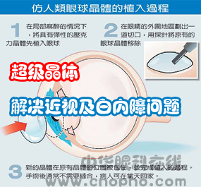 “超级晶体”由于具备超强的弹性,因此可以随着眼部肌肉的带动而调整形状,进而调整不同的焦距,看清不同距离的目标物。换言之,“超级晶体”除了可以排除白内障的发生几率外,还可以同时解决近视、远视和老花眼等问题,且不用每天花时间在戴眼镜或卸除眼镜上。