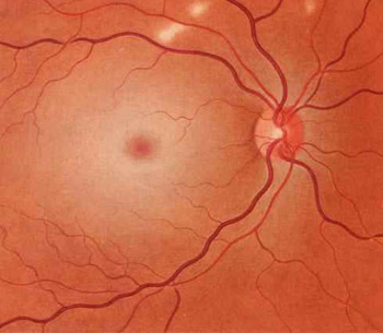 视网膜中央动脉阻塞:动脉痉挛,硬化莴 膜的增殖性炎症,以及循环内的栓子,均可导致该动脉阻塞。该动脉为终末动脉。一旦阻塞,视网膜内层营养中断。如为主干完全性阻塞,可迅速失明。如为分支阻塞,则出现相应的视野缺损。如果该眼存在视网膜睫状动脉,可保持部分中心视力。主干完全性阻塞:动脉狭细,后极部乳白色混浊,黄斑部呈樱桃红色。
