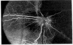 2.2 术中所见 (1)注入尿激酶等上述4种药物后(单独或依次连续),眼部及全身无不良反应,只在快速注入时视网膜中央动脉有血流中断现象,视盘一过性色淡,当停止或缓慢注入时血流恢复正常,视盘色泽在10~30min内恢复正常;(2)当注入荧光素钠后约2s,视网膜中央动脉显影(图2);(3)当快速注入泛影葡胺造影剂X光摄片观察见眼动脉及其分枝充盈良好,(图3)。
