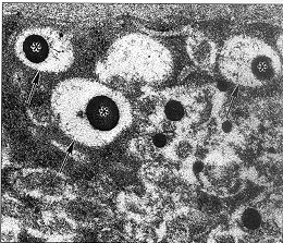 图8 内皮有大量的无界膜包涵物(箭号)内含有淡染色的原纤维粒物质和电子反差强的小体(星号)(×60000)