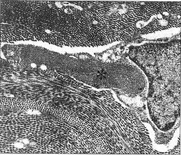 图7 A稠密的原纤维粒物质的沉积物(星号)与角膜细胞毗连(×30000)