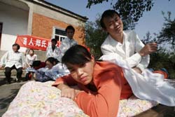 10月13日,安徽省巢湖市居巢区盲人郑云华(右一)和其他盲人正在该区散兵镇张山村为村民免费推拿。为迎接国际盲人节的到来,郑云华组织了此次到偏远山区的义诊行动,以回报社会。