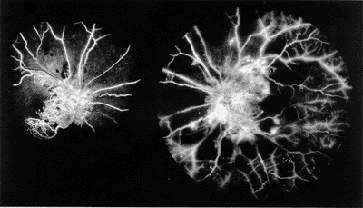 视网膜毛细血管的无灌注可容易地为荧光血管造影检查所证明。中周部毛细血管无灌注是糖尿病性视网膜病早期最常见型2,而在视网膜及视盘新生血管形成的眼内,毛细血管无灌注的范围更显著3。糖尿病眼内黄斑中心凹无血管区大于正常眼4,中心凹无血管区扩大的患者视力预后差,而其扩大程度与视力相关5。尽管我们的患者有严重旁中心毛细血管无灌注,但其左眼视力在就诊时,令人惊奇的是20/30。 |