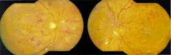 图1 合成的右眼(左)和左眼(右)后极部图像,显示视盘新生血管形成,散在的点状片状出血,棉絮状斑,小动脉变细及静脉变粗
