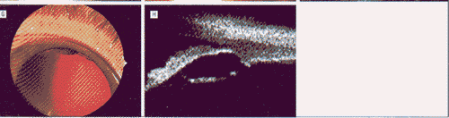 IPE腺瘤也应该与IPE囊肿相鉴别,特别是中间地带和周边部的囊肿。IPE囊肿分类和诊断途径已经在广泛报道中刊出25,26。中间地带的IPE囊肿表面光滑,柔软,并随着瞳孔扩大它在形状上趋于呈梭状(图2,E)。利用UBM,中部地带的囊肿显示为虹膜中间部分的后方透亮回声病灶(图2,F)。较周边部或虹膜睫状体囊肿会导致虹膜基质向前移位,类似于IPE腺瘤。然而,瞳孔充分扩大后房角镜检查结果显示清晰、透明的囊肿(图2,G)而非实性色素性肿块。周边虹膜囊肿的UBM结果显示周边部虹膜后方虹膜睫状体沟内的圆形透亮回声病灶(图2,H)27。漂浮的囊肿能迁移进入前房,并逐渐固定于房角,并可以与IPE腺瘤非常相似25。然而囊肿完全位于虹膜基质之前,而且病损透光。在某些IPE腺瘤病例,在实性团块内看到小的透亮回声囊肿,可能对应于我们第一个病例组织病理学所见中发现的囊性空腔12。超声活体显微镜检查在鉴别诊断不确定的情形下是值得采用的。27。