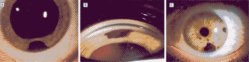 IPE腺瘤的特征性特征是虹膜基质向前移位和变薄,最终侵蚀,在裂隙灯活体显微镜下显露肿瘤。在一些病例中,肿瘤能通过前房延伸直至接触角膜后表面8。但是,在我们的病例中确实没有1例显示肿瘤象发生在虹膜痣、黑色素细胞瘤和黑色素瘤那样活跃地累及虹膜基质。尽管明显缓慢的进展,肿瘤的生长很少可得到辨认。