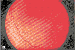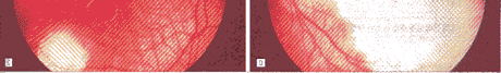 图1 1例2个月女婴,双眼家族性视网膜母细胞瘤。A,左眼中心凹颞下微小的视网膜母细胞瘤。B,温热治疗1年后随访,肿瘤消退成萎缩斑。中心凹完整,尽管在双眼共有16个肿瘤,全部经单独温热治疗,不需要化疗和外照射放疗
