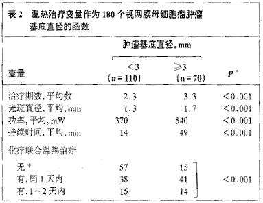 表2 温热治疗变量作为180个视网膜母细胞瘤肿瘤基底直径的函数