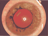 图4 大的视乳头旁视网膜母细胞瘤患眼,在70分钟温热治疗后出现局限性虹膜萎缩和中心旁晶状体混浊