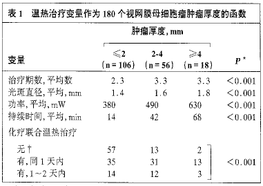 表1 温热治疗变量作为180个视网膜母细胞瘤肿瘤厚度的函数