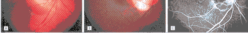图2 1例4个月女婴,双眼家族性视网膜母细胞瘤。A,右眼乳头黄斑区的小视网膜母细胞瘤。B,温热治疗联合化疗后,肿瘤完全消退成平坦的瘢痕。C,在眼底荧光血管造影上,乳头黄斑区的视网膜血管通过瘢痕上方灌注中心凹,随访3年以上,视力保持
