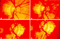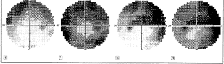 1例74岁的白人妇女被诊断为正常眼压性青光眼并随访5年。最初的诊断依据为房角开放,不用抗青光眼药物眼压不超过20mmHg。进行性青光眼性视野改变和视杯改变,无其他可能引起视神经病变的原因。用核磁共振作神经眼科检查以排除其他视神经病变的病因(包括脑膜病变、感染、炎症、缺血、脱髓鞘病或压迫性病变)。她有冠状动脉疾患和青光眼家族史。在随访的最后2年中,为了把眼压降得更低并阻止青光眼视神经病变的进展,她接受了局部β-受体阻滞剂治疗。