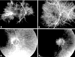 在最初的日曲线眼压测量(6 Am至5 Pm间3次测量及5 Pm至6 Am间3次测量)及每3~6个月复查时的压平眼压测量中,眼压从未超过20mmHg。用视野分析仪30-2程序(Humphrey Instruments, San Leandro, Calif)进行了视野检查。最初的视野缺损特征为双侧鼻侧阶梯和左眼固视点附近的深的旁中心暗点。这些缺损在青光眼变化可能性分析中与基础视野比较有进展。图1显示了患者去世前1年时的视乳头立体照相及第一次和最后一次视野检查(间隔为5年)。患者具有双侧大陷凹(左眼大于右眼)并在随访中进一步扩大。在常规视乳头检查中双眼均可见反复的视乳头出血。患者还有双侧严重的视乳头旁脉络膜萎缩,由α区和β区组成11。吲哚绿血管造影和荧光血管造影早期可见乳头旁区脉络膜毛细血管非灌注区。眼底荧光血管造影显示了与乳头旁萎缩α区相对应的窗样缺损。其中有视网膜色素上皮的色素和结构改变。其中位于颞下视乳头边界附近的一个非充盈区与乳头旁萎缩较重的区域(β区)相对应。在荧光血管造影的后期,在延伸到视盘的乳头旁严重萎缩区域内的先前的非灌注区中可见荧光渗漏(图2)。