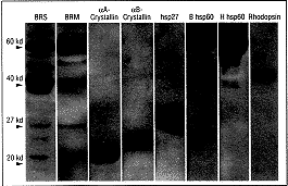 图3 正常眼压性青光眼的Western blot分析结果。每条包含患者血清(稀释,1∶1 000)抗小牛视网膜上清液(BRS)、小牛视网膜膜(BRM)(15μg/条),纯化的αA-和αB-晶体蛋白,热休克蛋白(hsp)27,细菌(B)和人类(H)hsp60,和视紫红质(3μg/条),如图所标。二抗(半抗人IgG)稀释1∶2 000