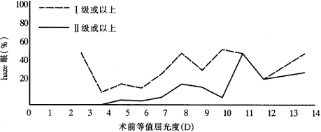 图1 术后3个月,haze与术前屈光度的关系