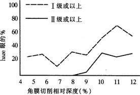 2.2 角膜雾状混浊(haze) 角膜混浊采用美国FDA标准分级。0级:角膜完全透明。Ⅰ级:仅在裂隙灯下仔细检查方能发现的细微混浊。Ⅱ级:在裂隙灯下较易发现的轻度混浊。Ⅲ级:中度混浊,通过混浊看不清虹膜结构。Ⅳ级:重度混浊。本组病例3个月时角膜混浊出现最多,且程度较重,占总眼数的30.9%,其中Ⅱ级和Ⅲ级混浊计24只眼,占总眼数的7.91%;12个月时有Ⅱ级和Ⅲ级混浊者计9只眼,占总眼数的3.38%。发现3个月时角膜混浊与屈光度、角膜切削深度和角膜切削相对深度的关系:屈光度与角膜混浊的发生率,随近视程度的增高而增加(图1);角膜切削深度大于50μm时,角膜混浊的发生率明显升高,其混浊的程度随切削深度的增加有逐渐加重的趋势(图2);角膜切削的相对深度超过9%时,角膜混浊的发生率明显升高,Ⅱ级以上混浊者更为明显(图3)。