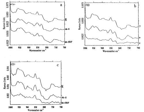 2.1 FTRaman光谱分析实验发现不同类型的RD患者血清的FTRaman光谱与健康人血清的很相似,它们的蛋白质结构也有酰胺Ⅰ、Ⅱ、Ⅲ和芳香族的基团频率振动,其中以酰胺Ⅲ的谱峰最大,但彼此的峰面积有区别(图1)他们的SRF在700-1000cm-1的振动因RD类型不同而有明显的改变(图2,a-c)。