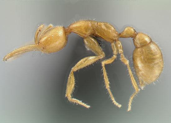 来自得克萨斯大学的克里斯蒂安·拉伯尔等人在新一期美国《国家科学院学报》上介绍说,这种蚂蚁通体呈金黄色,在土壤中生存,体长2到3毫米,没有眼睛,但有很大的大颚。由于它是肉食性蚂蚁,拉伯尔等人猜测它的大颚是捕食的利器。