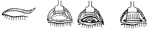 1.2 手术方法 按重睑术方法设计切口线,最宽处距睑缘为6~8mm。最高点位于瞳孔外缘线上,皮肤须作部分切除(设计方法如图1),皮肤切除的多少与眼睑下垂的程度有关,多为2~3mm。切开皮肤、皮下组织,将睑板前的眼轮匝肌及其它组织切除,暴露睑板,对上睑肿胀明显有眶脂脱垂者可切开眶膈,摘除部分脂肪组织。在暴露上睑板中央作梭形切口设计线,宽度约3mm左右,上缘切口线须离提上睑肌睑板附着处2mm左右,下方离睑缘约2~3mm,长度可视睑板的长度而定,以不超过睑板长度为准。设计好后,在眼下穹隆处滴数滴10g·L-1地卡因溶液行表面麻醉,5min后,将睑板垫垫入上睑与眼球之间,用尖刀沿设计线切开睑板(图2、3),并切除部分睑板,有经验者可免去滴用地卡因麻醉及使用睑板垫直接将睑板提起,切除部分睑板,用剪刀修剪睑板边缘,使其准确对位,并可让患者睁眼,以判断睑缘的位置。用3-0丝线间断在睑板层内缝合睑板,约6针,尽量使其结膜面平整。缝合完毕后,让患者睁眼或闭眼并将重睑设计线上方的皮肤,平坦置于缝合的睑板前,根据其皮肤多余的量行皮肤部分切除,间断缝合皮肤,注意使重睑线下的皮肤平坦,并与睑板上缘相贴,术后局部使用抗生素眼膏,加压包扎,2d后拆除包扎,眼部滴抗生素眼液。