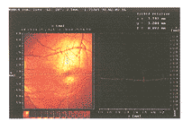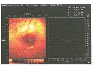 1.3 检查方法: 被检测者取坐位,无需扩大瞳孔,双眼正视前方,调节激光强度与敏感度,使整幅图像光线均匀,无过亮或过暗区。摄取图像后检查眼球运动情况,运动大于2次则删除,每只眼测3次,取平均值。