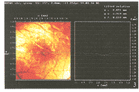 1.4 图像处理与统计分析: 画出黄斑病变边界,以周围平坦的视网膜为参考平面,通过HRT内置软件(version2.01)自动计算出黄斑区平均最大深度、凹陷的面积及周围视网膜隆 起的高度,并记录黄斑病变的形态。计算其平均值与标准差,病变组与对照组行t检验。