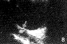 眶内囊尾蚴8例10眼。位于下直肌肌腹内1眼,内直肌肌腹内3眼,上直肌肌腹内和肌附着处各1眼,外直肌肌腹内1眼,肌附着处2眼,上斜肌肌腹内1眼。眼外肌囊尾蚴均表现为病变眼外肌增厚,囊尾蚴周围尤甚,内回声明显减弱,其中见无回声液性暗区者8眼,暗区大小不等,形状不一,有圆形、卵圆形及管状等,最大径9.78mm,最小径3.09mm,液性暗区内均见直径1.03~2.06mm强回声球形光斑(见图7)。2例仅见球形光斑,看不到周围液性暗区(见图8)。10眼中超声探头固定不动光斑时大时小者5眼(均出现在液性暗区内)。