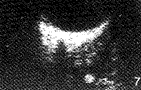 视网膜下囊尾蚴中5例位于后极部,2例位于周边部。4例合并视网膜浅层脱离者表现为球壁浅层膜状隆起,后运动轻微,膜下无回声液性暗区中一强回声球形光斑,其直径1.03~1.30mm,且随膜状隆起物前后摆动,光斑向内层侧靠拢,未见光环(见图5)。3例表现为球壁局限性隆起突向玻璃体腔,前缘光滑、锐利,其内一强回声球形光斑,随光斑的时大时小,前缘呈波浪状运动。增益降至周围组织回声较弱时,前缘与球形光斑间出现透声裂隙,未发现明显视网膜脱离(见图6)。