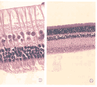 图1 正常对照组(×40) 图2 RD阳性对照组(a ×10);b:光感受器结构紊乱,神经节细胞水肿和空泡样变,M%26uuml;ller细胞支架纤维结构消失(×40) 图3 1周实验组(a ×10);b:光感受器排列紊乱,内核层和神经细胞层水肿,空泡出现(×40) 图4 2周实验组内核层和神经节细胞均有空泡样变(×40) 图5 3周实验组见部分内核层和神经细胞有核固缩,核周空泡现象(×40) 图6 4周实验组见视网膜结构光镜下结构清晰正常,与对照组相比无明显差异(×40) Fig.1 Normal control group(×40) Fig.2 RD control group (a ×10); b:disturbance of photoreceptor cells,swelling and vacuole of ganglion cells,disappearance of fiber structure of M%26uuml;ller cells Fig.3 1 week experiment group (a ×10); b:disturbance of photoreceptor cells,swelling and cava appearance of inner nuclear layer and ganglion cells Fig.4 2-week experiment group:vacuolar degeneration in inner nuclear layer and ganglion cells(×40) Fig.5 3-week experiment group:nucleus and cytoplasm shrink in part of inner nuclear layer and ganglion cells (×40) Fig.6 4-week experiment group:normal appearance and clear structure of retina,compared to normal control with no obvious difference (×40)