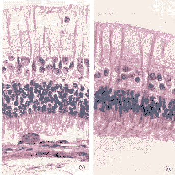 2.5 术后3周实验组(图5) 光镜下所有眼视网膜均复位。视网膜结构基本清晰,偶可见吞噬色素的单核细胞。RPE层正常外观。光感受器细胞形态基本正常,局部有空泡样变性。内外核层、网状层结构仍有少许紊乱,外网状层有少量囊变。神经节细胞和神经纤维层形态正常,少量神经节细胞囊变。M%26uuml;ller细胞纤维支架结构清晰。