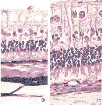 2.3 术后1周实验组(图3) 光镜下2眼视网膜复位,1眼局部有浆液性扁平RD。所有眼均可见在视网膜不同层间有空泡样变性,视网膜内还可见少量有色素的吞噬细胞。RPE层基本正常。光感受器细胞层结构排列紊乱,缺失变薄,仍有空泡样变性。内外核层、网状层结构紊乱,囊变,表现为细胞变大、水肿。神经节细胞轻度改变,部分细胞有水肿,神经纤维层空泡出现。部分部位视网膜上M%26uuml;ller细胞支架纤维消失。1眼光感受器细胞层和色素上皮层间可见有浆液性渗出液,其中RPE游离、肥大、增生,少量淋巴样细胞浸润。