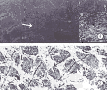 图1,2 对照组(上)和实验组(下)Best卡红染色光镜照片,肌糖原呈红色(×10) 图3 注药后1周电镜照片见肌浆网的增多和扩张(空泡状),线粒体的基质着色加深(黑色团状),肌糖原颗粒增多(黑色点状散在)(×15 000) 图4 电镜下注药后1月眼外肌出现肌原纤维的阶段性痉挛(箭头)(×7 000),线粒体嵴紊乱、消失(×60 000),见右下脚小图 图5 电镜下注药后2月眼外肌出现不可逆萎缩(箭头)(×4 000) Fig.1,2 Best stain in pre-injected BTA extraocular muscles(up)and in test groups(down)by light microscope.LM×10 Fig.3 It’s been found that the amount of sarcoplasmic reticulum has developed and expanded(vacuole shape),the basement color of the mitochon-dria has developed(black dumpling shape),and the amount of muscle glycogen has also developed after one week injection(scatter black drops).EM×15 000 Fig.4 One-month after injection,it was found that myofibril has spasm in segments(arrow).EM×7 000 it was also found that the basement of the mitochondria disordered and vanished(right bellow).EM×60 000 Fig.5 Two months after injection,the extraocular muscle was found in an irreversible atrophy(arrow).EM×4 000
