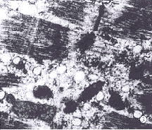 发现兔眼外肌随注药后时间的延长有以下改变:注药后1周出现肌浆网的增多和扩张,线粒体的基质着色加深,肌糖原颗粒增多。见图3。注药后1月可见肌原纤维的节段性痉挛。肌浆网的增多和扩张更加明显,肌糖原颗粒增多更显著。线粒体嵴紊乱、消失。见图4。注药后2月出现肌原纤维的节段性溶解、消失。见图5。