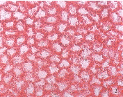 各眼球角膜均发现炎性反应,有浆细胞和淋巴细胞浸润,且主要集中在角膜缘血管网周围,炎症的严重程度虽有不同,但都局限在角膜基质层的外1/5厚度内。前房注射5-Fu为0.5μg/ml时,角膜透明,角膜内皮细胞计数及六边形率大致正常,细胞形态无明显变化(见图1),角膜缘炎症为灶性,炎性细胞散在分布(炎性细胞计数见表2),虹膜基质偶见浆细胞浸润;质量浓度为5mg/ml时,角膜透明,内皮细胞计数及六边形率降低,细胞膜增厚,蛋白物质沉积,角膜缘炎症为小片状,淋巴细胞显著增多,虹膜及睫状体有炎性细胞散在分布;质量浓度为25mg/ml时,除上述改变外,可见角膜浸润、水肿及内皮细胞膜上串珠样蛋白物质沉积(见图2),角膜缘炎性细胞呈团状或带状密集分布,浆细胞显著增多,虹膜及睫状体可见灶性炎细胞浸润。