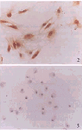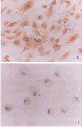将细胞爬片和细胞涂片放入0.5%H2O2中30min,以消除内源性过氧化酶活性。蒸馏水洗3次,滴加山羊血清封闭液,室温下10min,以封闭非特异性抗源。甩去山羊血清,分别滴加兔抗人、大鼠、小鼠TGF-β1,-β2和TGF-βRⅠ,RⅡ,RⅢ单克隆抗体(美国Sigma公司产品),4℃湿盒中过夜。第2天取出后用PBS洗3次,滴加Supervision过氧化物酶-山羊抗兔IgG(武汉Boster公司产品),置37℃湿盒中30min,PBS洗4次,DAB显色,显微镜下观察至出现棕黄色阳性信号,水洗终止反应。苏木素轻度复染。梯度酒精脱水,二甲苯透明,光学树脂封片,镜下观察拍照。阴性对照以PBS代替第1,2抗体,阳性对照分别选用皮肤和乳腺癌标本。