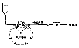 即完全堵塞超声乳化针头,实现和保持峰值负压的操作状态。实现峰值负压时,管道内液体停止流动。在文丘里泵系统中,超声乳化针头是否堵塞,对峰值负压的形成没有影响;在蠕动泵系统中,超声乳化针头全堵是实现峰值负压的必备条件。在全堵状态下,因保留灌注,眼内压维持在高水平(图2)。