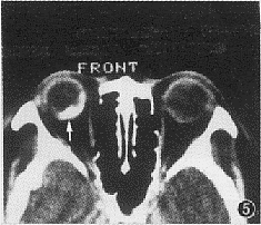5 CT检查眼内囊尾蚴病 (非活动期) , 眼环不均匀增厚, 后部眼环呈致密影 (箭头) , 为囊尾蚴死亡后的钙化斑