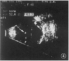 4 B超检查眼内囊尾蚴病 (非活动期) , 玻璃体内可见两个强回声光斑 (箭头) , 为钙斑影, 光斑后伴后方声影, 其周围可见不规则中等回声条状物