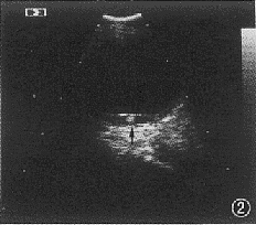 2 B超检查眼内囊尾蚴病 (活动期) , 视网膜下球形强回声光斑 (箭头) , 为头节影, 周围为无回声液性暗区, 其前方条状强回声光带为脱离的视网膜