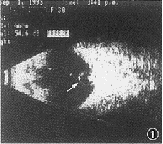 图1 B超检查眼内囊尾蚴病 (活动期) , 玻璃体后部椭圆形光环, 环内无回声液性暗区中强回声球形光斑 (箭头) , 为囊泡及头节影