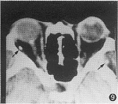 9 CT检查眶内囊尾蚴病 (非活动期) , 右侧外直肌及左侧颞窝内两斑点状致密影 (箭头) , 为囊尾蚴死亡后的钙化斑