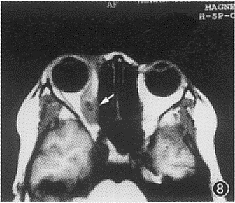 8 MRT 检查眶内 囊尾蚴病 (活动期),T1加权像右眼内直肌梭形增粗, 肌腹部可见一低信号囊泡, 囊泡内中低信号 (箭头) 为头节影