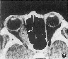7 CT检查眶内囊尾蚴病 (活动期) , 右眼内直肌梭形增粗, 肌腹部有一圆形低密度区, 其内一斑点状高密度影 (箭头) , 为囊泡及头节影