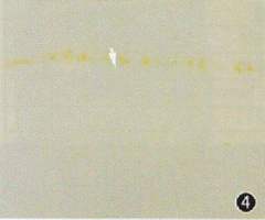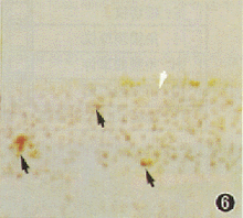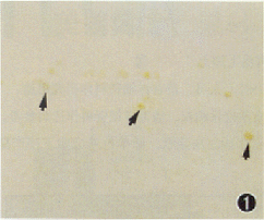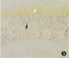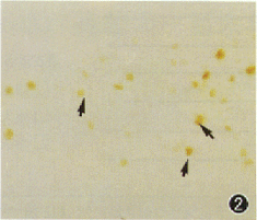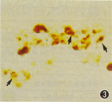 图 2,3 RCS大鼠生后第30、 35天视网膜,可见阳性染色的视细胞核数明显增加 (箭头)TUNEL×200