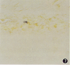 图 7 视网膜P53 mRNA原位杂交, 可见正常SD大鼠视网膜,ONL示外核层, 呈阴性?位杂交阳性染色×100