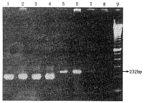 1~4示对应的β-actin mRNA产物 5~8示第25、35、60天RCS大鼠及第35天正常SD大鼠视网膜p53 mRNA产物 9示DNA marker