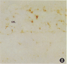 图 8 视网膜P53 mRNA原位杂交, 生后第28天RCS大鼠视网膜,ONL 示外核层呈显著阳性染色原位杂交阳性染色×100