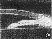 10 多种机制共存型 (瞳孔阻滞 %26#02; 睫状体前位型) 闭青, 术后周边虹膜变平坦, 但仍见前位的睫状体将周边虹膜顶向房角, 房角狭窄关闭