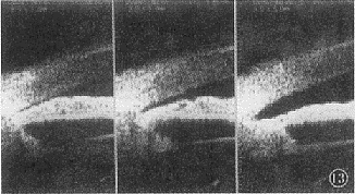 12 多种机制共存型(瞳孔阻滞 %26#02; 睫状体前位 %26#02; 周边虹膜肥厚) 闭青, 术后周边虹膜较术前平坦, 但前位的睫状体及虹膜向周边堆积, 致房角狭窄关闭